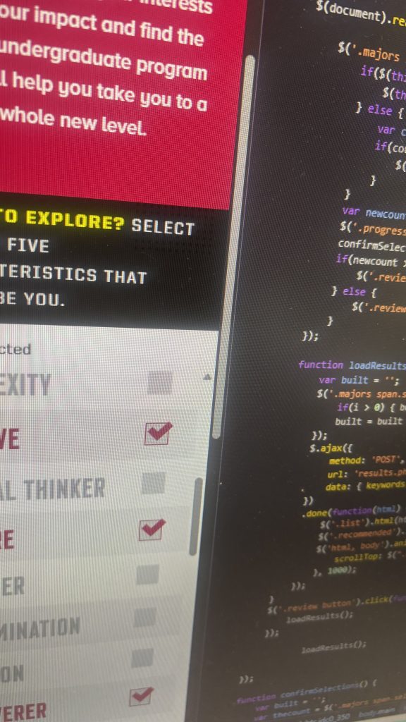 Students selected five adjectives from a curated list, traits like “analytical,” “creative,” or “collaborative.” Behind the scenes, I built a custom scoring system that mapped each attribute to a set of majors, assigning weighted correlations for each. (So if you select “analytical,” accounting will be weighted higher for you. Select “artistic,” and accounting moves to the bottom.)